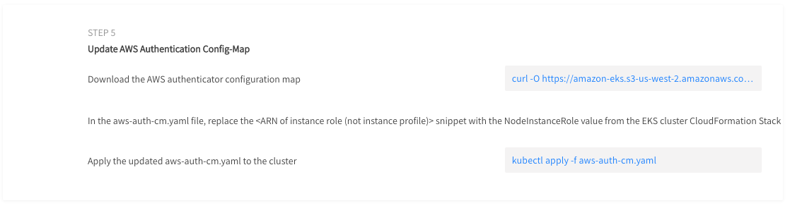1. Connect your workstation to the EKS cluster by copying the command shown in Step 4 of the Create page and running it in your command-line interface. Note that the command must include the Ocean Cluster Name that you entered previously.